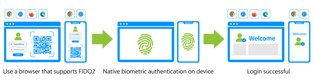 It is composed of the Web Authentication (WebAuthn) specification by the World Wide Web Consortium (W3C) and the Client-to-Authenticator Protocols (CTAP) by FIDO. Its key feature is its support for major browsers, including Google Chrome, Mozilla Firefox, Microsoft Edge, and Apple Safari. When users log in to the system through these browsers, they can utilize the native biometric authentication capabilities of their devices, achieving passwordless authentication.