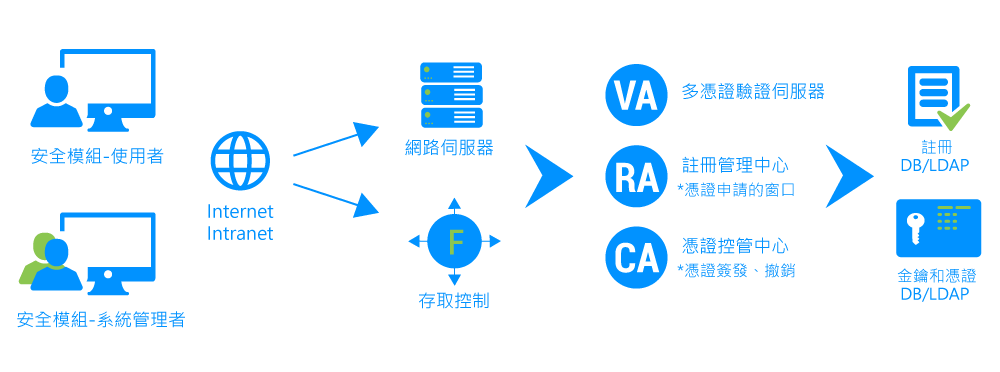 安控中心會檢查每位使用者的身份及權限,以確保唯有獲得授權者才能進入相關的網頁進行憑證處理。