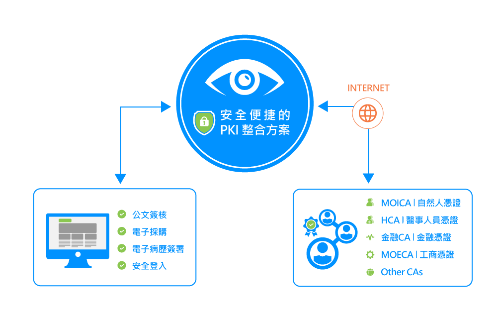 PKI(Public Key Infrastructure)系列產品能夠直接的與企業組織內外之各種應用緊密結合,企業內部一般的應用如:遠端安全登入、電子郵件軟體、手機安控;到企業外部之特定應用如:訂單交換、電子票據、電子採購、電子發票等。此外,PKI系列產品都備有一套跨平台支援的安控元件,提供使用者高度的客製化彈性,使後續進行規劃開發之各式客製化系統均能夠利用此安控元件提供的應用程式介面享受到PKI所帶來的好處。後端資料庫儲存媒體方面,PKI除了支援各大廠牌之資料庫系統及目錄伺服器,全景PKI亦能整合至崁入式系統等系統限制較多的作業環境,提供各式應用上的最大可能性。 組織的核心價值。